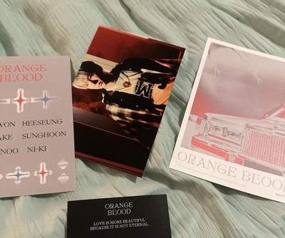 - After reaching a milestone with their Top 5 album on the Billboard 200, ENHYPEN members JUNGWON, HEESEUNG, JAY, JAKE, SUNGHOON, SUNOO and NI-KI are back with a new album titled ORANGE BLOOD to continue their story. Available in two versions: KSANA Ver. and KALPA Ver. Contents include: CD, Sleeve Case, Photo Book, Photo Card A (random 1 of 7), Photo Card B (random 1 of 7), Sticker, Photo Paper (random 1 of 7), Postcard, Poster with Lyrics and Fragrance Card. Dimensions: 245 x 175 x 13.5 mm.