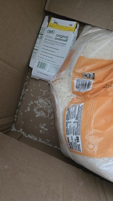 The bag broke and the rice fell all over the box