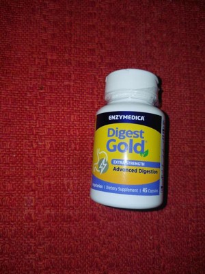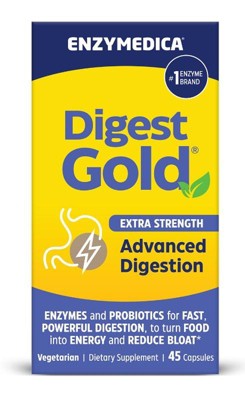 Say goodbye to occasional gas, bloating, and indigestion with Digest Gold Advanced Digestion Extra Strength from Enzymedica, the #1 Enzyme Brand.* This advanced formula supports better digestion, helping you feel your best after every meal.* Each capsule is packed with digestive enzymes to efficiently break down carbohydrates, dairy, fats, fibers, and proteins.* Enzymedica's exclusive Thera-blend® technology blends multiple strains of enzymes to ensure they work across your entire digestive tract.* Digestive enzymes work in harmony with probiotics, which help support gut health and regularity, maintain a healthy microbiome, and ensure your digestive system stays balanced.* Together, this 2-in-1 enzymes and probiotics formula keeps your digestion and overall wellness on point.* Feel the Digestive Difference after your next meal!*