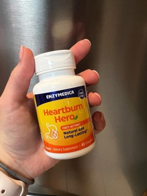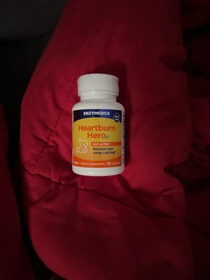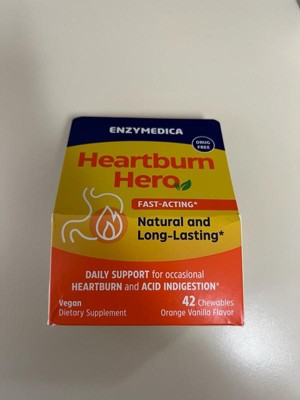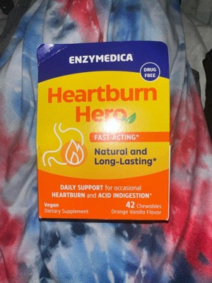 Quickly relieve heartburn with Heartburn Hero, a natural, non-drug alternative from Enzymedica, the #1 Enzyme Brand.* Heartburn Hero is the fast-acting and long-lasting natural solution for occasional heartburn or acid indigestion resulting from food, diet, or lifestyle choices.* Each serving of orange-vanilla flavored chews includes natural ingredients—without the negative side effects caused by over-the-counter heartburn remedies.* Our key ingredient, alginic acid made from brown seaweed, forms a protective raft at the top of your stomach that helps hold acid back.* Clinically proven to be effective for rapid relief, alginic acid has been used for over a century.* Calcium carbonate neutralizes stomach acid, while prickly pear helps soothe the digestive tract, reducing irritation from acid.* Heartburn Hero is not a traditional acid blocker; instead, it works by keeping acid in the stomach where it belongs.* Feel the Digestive Difference after your next meal!*
