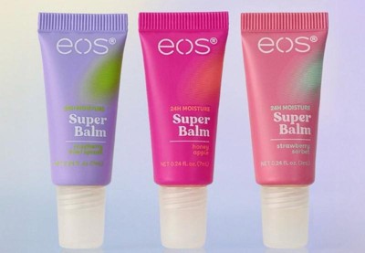 Your favorite eos Super Balm flavors Honey Apple, Raspberry Kiwi Splash, and Strawberry Sorbet now in adorable minis! These collectibly sweet balms deliver 24-hour moisture with a trio of deeply hydrating butters to soothe and smooth lips on the go.