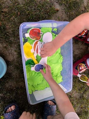 [This review was collected as part of a promotion.] The sensory bin comes in a very nice plastic bin to hold everything in one place making storage easier. My kids love playing with the bright green kinetic sand using the shovel to dig around and find the caterpillar.