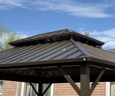 - [ GALVANIZED STEEL ROOF ] - Beautiful hard metal top instead of normal fabric or polycarbonate material.Compare to a traditional soft top,this kind of gazebo roof is strong enough to withhold any heavy snow and offer unbeatable stability in windy conditions.