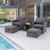 - Modern, elegant styling and solid build quality, are the hallmarks of this 5-pieces patio furniture set. The straight lines of the frame are softened with hand-woven resin wicker. The 2-tier side table offers you extra space to store books, drinks, or whatever else you like. Great size for a small apartment balcony, an ottoman can be placed under the chair, and a side table can nest together for you. Featuring rattan, this seating set exudes elegance and comfort in a classy way. This lounge chair set with a storage side table is the perfect laid-back spot to spend your time!