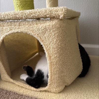 - 【Premium Material】Our multi-level cat tree is constructed from teddy velvet, a breathable, stain-resistant, and warm material that provides a cozy experience for kittens. The reinforcement posts are wrapped in natural sisal rope, offering a durable and satisfying scratching surface for your cats. Not only does it fulfill their natural instincts, but it also plays a vital role in protecting your furniture.