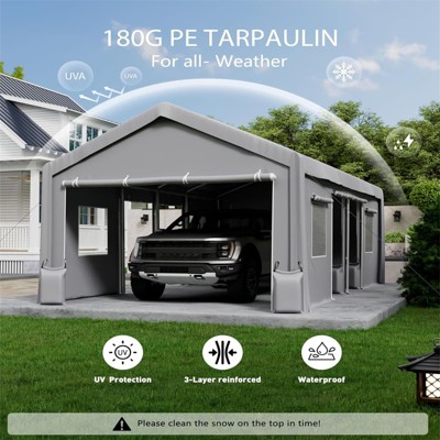 - 【ENHANCED EDGE REINFORCEMENT】The reinforced rim of the carport cover enhances stability and prevents tearing; This thoughtful design ensures the tarp can withstand severe weather conditions, providing a stable and durable solution for protecting your vehicle.