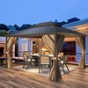 - Fully enclosed zippered removable double-layer PBV-coated curtains and netting protect you from UV rays while adding more privacy. Equipped with "U" & "J" hooks on the top roof, it can be used to hang up the lights and fans to enrich the aluminum hardtop gazebo.