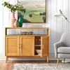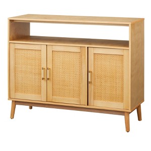 The Ervine Sideboard with Rattan Panel Doors from Buylateral offers an ideal balance of storage and style. The doors, designed with real rattan for visual texture, have an adjustable shelf behind them which makes it easy to store your dishware, serve ware, and bowls of varied sizes. A convenient open shelf allows easy access to everyday items, keeping essentials within reach. Constructed with durable MDF and solid rubberwood legs, the natural finish is accented with gold tone drawer pulls covered in vegan leather for a touch of contrast.
