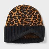 Add fierce style to your winter accessories with this Essential Cuffed Beanie from Universal Thread™. This jacquard-knit hat features an allover black-and-brown leopard-spot print against a light brown background, adding visual interest to your cold-weather look. It's contrasted with a black ribbed cuff that provides a comfortable, secure fit around your head. The versatile style pairs effortlessly with everything from casual weekend outfits to everyday essentials, making it a must-have accessory for chilly days.
