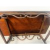 - Design: Features a rectangular wooden tabletop with a weathered, brown finish, complemented by a metal frame with ornate scrollwork detailing beneath the tabletop. The metal legs have a simple, slightly angled design.