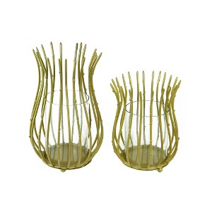 - Material: Each candle holder has a slightly flared, hourglass shape. The outer metal frame is composed of thin, irregularly shaped metal rods, giving it a whimsical, stick-like appearance. A clear glass cylinder sits inside each holder to contain the candle.