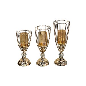 - Material: The candle holders are made of metal and glass. Each candle holder has a decorative circular base and a tall stem with a round crystal-like accent. The top features a cage-like structure made of vertical metal rods. A hurricane candle holder with a ribbed pattern sits inside the cage.
