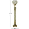 - Material: The candle holders are made of metal and glass. Each candle holder features a round, decorative base and a ribbed stem. The stem has a clear, faceted crystal sphere. A cage-like metal frame with an open, flared top holds a golden glass hurricane at the top.