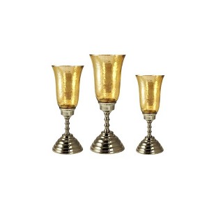 - Color: Silver: The metal bases and stems are a reflective silver color. The glass hurricanes are an amber or golden yellow shade.