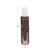 - Color: The mosaic is made of small, dark tiles that transition into a lighter, coppery-pink or rose gold color towards the bottom. The metal rims at the top and bottom are also a shiny, coppery, rose gold color. The clear glass cylinders are transparent and colorless
