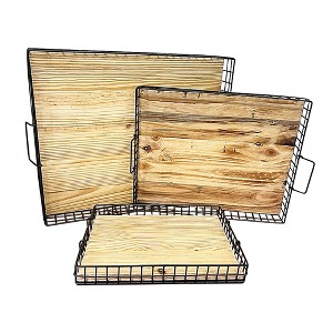 - Material: Iron wire with wood. Design: Each tray is rectangular with a flat wooden base and an open-grid iron wire frame forming the sides. The iron wire extends upwards and curves to form integrated handles on the shorter sides of the trays. The wooden base has visible grain, contributing to a rustic aesthetic.