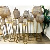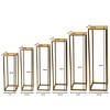 Amplify your greenery with this stunning set of six gold planters, a perfect blend of modern elegance and functional design. This set includes six individual planters of varying heights, creating a visually dynamic display that adds depth and interest to any space. Each planter features a sleek, minimalist metal frame with a luxurious gold finish, providing a sophisticated touch to your home or garden. The planters are ideal for showcasing a variety of plants, from cascading vines to vibrant flowers, transforming your space into a botanical haven. Whether grouped together for a dramatic statement or placed individually throughout your home, these gold planters bring a touch of glamour and sophistication to your plant display. Sizes: XXL - H43 x L14.5 x W14.5 inches XL - H40 x L13 x W13 inches L - H38 x L11.5 x W11.5 inches M - H36 x L10 x W10 inches S - H34 x L8.5 x W8.5 inches XS - H32 x L7 x W7 inches
