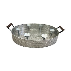 - Material: Galvanized Metal Design: The candle holder is an oval-shaped tray with a ribbed texture along its sides. It features two dark-colored wooden handles on the shorter sides. Inside the tray, there are six individual holders designed to secure pillar candles.