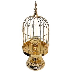 - Material: Metal Design: The candle holder has a decorative circular base that leads up to a candle plate. A birdcage-like cage made of thin metal rods sits on the candle plate. The top of the cage has a pointed finial.