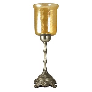 - Silver: The metal base and stem are a dark, tarnished silver or pewter color with an antique finish. The glass hurricane is a warm, golden yellow or amber color.