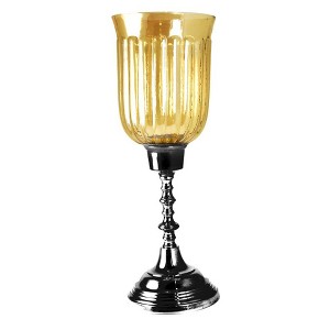 - Silver: The metal base and stem are a dark, polished silver color. The glass hurricane is a warm, golden yellow.