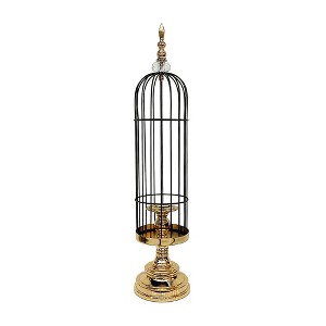 - Material: Metal Design: The candle holder features a wide, ornate circular base with a fluted design. The base leads to a cylindrical cage-like structure made of thin metal rods. The top of the cage is topped with a clear crystal-like orb and a pointed finial. A candle plate is located inside the bottom of the cage.