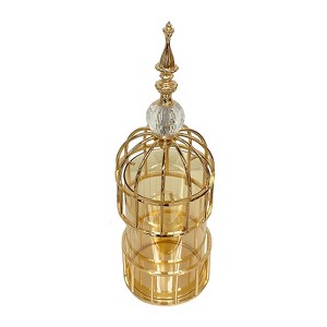 - Material: Metal Design: The candle holder features a round base and a cage-like body formed by vertical metal rods. The body is divided into two sections by a horizontal ring. A candle plate is located at the bottom. The top has an ornate finial with a round, polished glass accent.