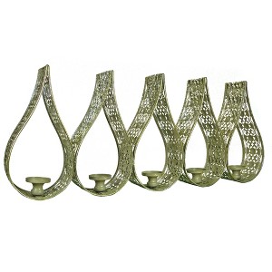 - Material: Metal Design: The candle holder features five interconnected, tear-drop or loop-shaped segments arranged in a row. Each segment has a finely detailed, perforated pattern within its metal frame. A small, round candle cup is located at the base of each tear-drop segment.