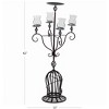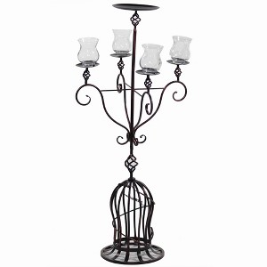 - Material: Metal Design: The candle holder has a large, round base from which a flared, cage-like stem rises. A central pole with decorative spiral accents extends upwards, branching out into four curved arms. At the end of each arm, and on top of the central pole, is a round plate to hold a clear glass hurricane candle cup.