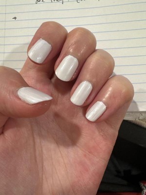 [This review was collected as part of a promotion.] White nail polish can be hard to find. So this was fine not the best because it's watery. The white is too see through and the polish is messier than usual. You have to do several coats unless you pack it on the first time but that makes it harder to dry. It's harder to remove than the other colors . It's kinda chalk like, it's not the best.