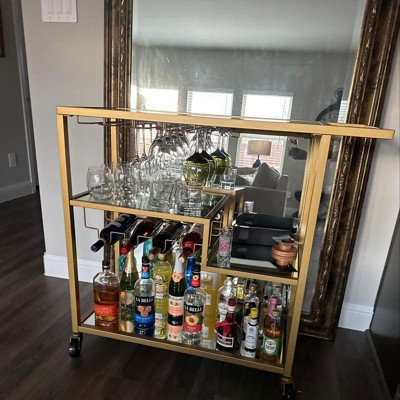 I am overall very happy with this bar cart. Lots of room for storage and styling, the color of the cart is a muted gold which I think looks nice in a home without being overbearing. The mirrored glass is good quality and the wire rack is well assembled to hold your closed bottles of wine. Overall the look is really attractive. My only nitpick is that the metal part of the cart does scratch easily. Be careful putting it together.