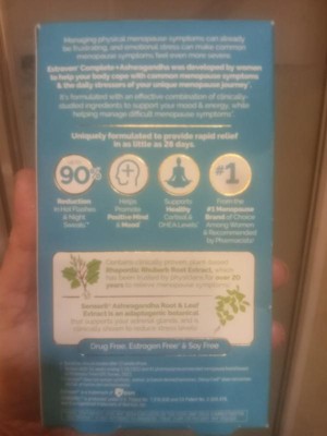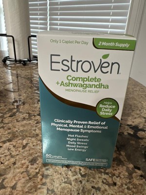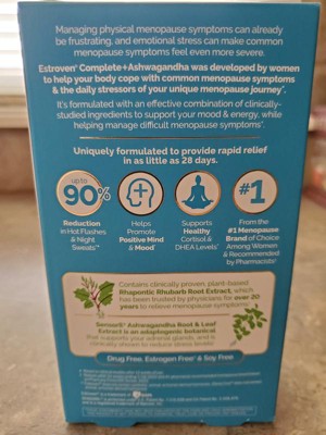- As if menopause symptoms weren't bad enough, daily stress makes symptoms like hot flashes feel even more severe. At the same time, the decline of estrogen with menopause increases stress and irritability creating a vicious cycle of stress and menopause symptoms. Help stop the vicious cycle with Estroven Complete + Ashwagandha. Ashwagandha is a well-known adaptogen that lowers perception of stress while rhapontic rhubarb extract mitigates the loss of estrogen with menopause.