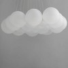 Clusters of glass globes in various sizes and color are suspended from a central point and burst outward. Configurations include a 4-Light, 9-Light, and 12-Light cluster and can be mounted close to the ceiling or included down rods to extend the height. Choose from options of Clear or Frosted glass globe clusters paired with Satin Nickel frames for an airy transitional design or be bold with Mirror Smoked glass or a varied combination of the glass including amber tinted suspended on a Matte Black frame with thin black cables. Small-scaled LED G4 lamps are included with the fixtures and centered in the glass accentuating the scale of the glass.