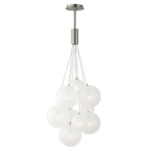 Clusters of glass globes in various sizes and color are suspended from a central point and burst outward. Configurations include a 4-Light, 9-Light, and 12-Light cluster and can be mounted close to the ceiling or included down rods to extend the height. Choose from options of Clear or Frosted glass globe clusters paired with Satin Nickel frames for an airy transitional design or be bold with Mirror Smoked glass or a varied combination of the glass including amber tinted suspended on a Matte Black frame with thin black cables. Small-scaled LED G4 lamps are included with the fixtures and centered in the glass accentuating the scale of the glass.