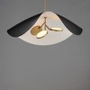 Poetic and organic in design, the undulating form of the metal shade appears to float effortlessly on a slender frame. Abstract discs of LED lighting are encased in round, adjustable heads so that the light can be directed upwards for indirect lighting reflected on the internal white painted face of the shade or the light sources can be rotated downward to provide bright illumination exactly where needed. The simple, sculptural form adds dimension in its scale evocative of a manta ray or the seductive quality of a woman wearing a large floppy hat.