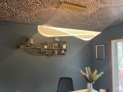 It’s a really modern “futuristic” looking light. Mine has lines and not dots on the wing as depicted in the pictures. Looks great from the side and below, but skinnier and a little lack luster from head on view. The light is very bright but looks great on the dimmer!