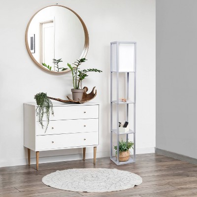 Reserve some of your best wine while illuminating your living space in style with our 62.5" floor shelf lamp and wine rack. This gorgeous piece adds versatility as the shelves can be used to display photographs and other memorabilia, while accommodating space for your wine glasses and bottles. The linen lamp shade casts a soft, warming light throughout your living space. This lamp adds sophistication and style to any home's decor.