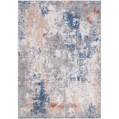 The modern style of this rug is underscored by an abstract pattern that features a harmonious blend of grey and blue hues punctuated with strokes of warm ochre, creating visual interest and contemporary appeal. The patterning suggests movement and fluidity, making this rug a dynamic centerpiece in any room.