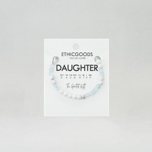 DAUGHTER The Greatest Gift This Morse Code bracelet is available in our MINI Collection! They are perfect for toddlers through elementary aged girls AND they match our Mother Morse Code Bracelets! How to read your bracelet: A Morse Code dot is one bead and a dash is two beads in the alternating color. Start at the small gold spacer bead and follow the Morse Code spelling around the bracelet! Your purchase helps to provide economic empowerment for women who are survivors of human trafficking and exploitation. Each piece is handcrafted by the woman it helps to employ. Through wearing Ethic Goods, you become a meaningful part of her story, and give freedom to women around the world.