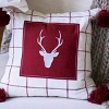 Inspired by roaring fires, log cabins, and family, this tassel pillow cover reflects the joyous time of the holiday season. The deep hue of cherry red with the textured ivory material beautifully complements the decorative tassels, windowpane plaid pattern, and the embroidered reindeer stitched against the solid square applique. Includes throw pillow cover only, simply pair with a cushion insert to complete the look. Pair this stylish decorative accent with more complementary home pieces from the rest of the Eva & Co. designer line collection for a modern farmhouse styled Christmas space.