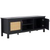 Uplift any corner with the breezy elegance of our Evane media stand. Our streamlined media unit charms with its rich textures and elevated details. A rattan mesh upon the cabinets lends a dose of warmth and casual elegance. The stepped mitered cabinets add a well-loved transitional appeal to our media stand. Enriched in a black finish, the media stand brings warmth and breezy charm to your living space or bedroom. It features both open and closed storage to house your media equipment, books, and favorite decorative objects.