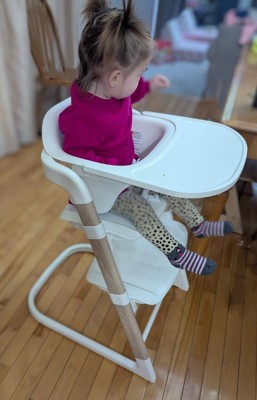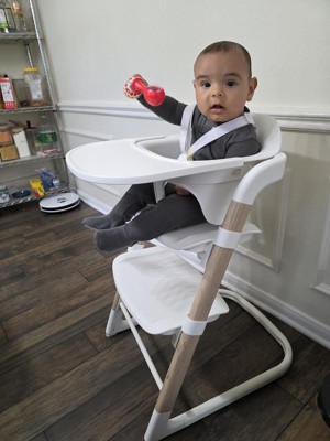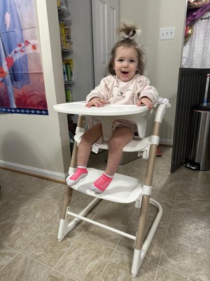 [This review was collected as part of a promotion.] I had received this product as part of the stellar review panel. This high chair is very easy to assemble and so lightweight that you can easily move it wherever you may need it. It is regular table height making it easier to comfortably feed your child while sitting at the table yourself. It is a nice clean sleek design that goes perfrectly with any home decor and does not look out of place with your furniture. I had used it for my one year old at meal time but also used it for a booster seat for my toddler who loved sitting in it. It was very easy to adjust the straps and footrest to meet our needs in limit time. When I first received it, I was a bit skeptical of the white coloring of the high chair, afraid it would easily stain from blueberries, tomatoes sauce or any other food that easily stains close. I was relieved to see it was easy to wipe up and left no discoloration of the surfaces. It has quickly become a necessary high chair in our house.