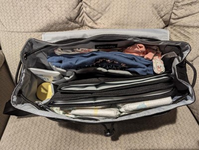 - ORGANIZE YOURSELF FOR TRIPS OUT: spacious interior opens wide for easy packing and the light-grey liner helps you find what you need quickly; inside: padded cupholder for 5 in. h cup or bottle, 3 mesh pockets, slide-in device pocket and key ring loop; outside: zippered pocket with included 15 in. x 21 in. l padded changing pad, 2 gusseted side water bottle pockets; holds a maximum of 7 lb.