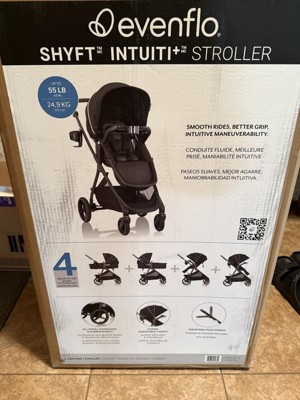 Introducing parenting on the go raised to a higher standard: The Evenflo® Shyft™ Intuiti+™ Stroller. With maneuverability that feels intuitive, this luxe stroller boasts all-wheel suspension and premium rubber tires to cushion the bumps along the way. Its modular frame allows you to parent-face or forward-face your baby in all modes: infant car seat (car seat sold separately), toddler seat and lay-flat carriage. The articulated leatherette handle adjusts to three positions, allowing you to find your most comfortable height. The extra-large, expandable UPF 50+ canopy helps protect against the elements and grows with your child to 43 in. (weighing up to 55 lb) with three adjustable heights. This refined stroller is loaded with thoughtful extras, including an extra-large stroller basket with hidden pocket for discreetly stashing your phone, keys or other small essentials, linked brakes to lock both rear wheels at once, BPA-free child tray for snacks on the go, convenient parent cup holder, plus luxurious fabrics and finishes. Intending this for your tiny rider? Shyft Intuiti+ is compatible with Evenflo Revolve180™ LiteMax™ NXT Rotational Infant Car Seats and LiteMax™ NXT Infant Car Seats (both sold separately).