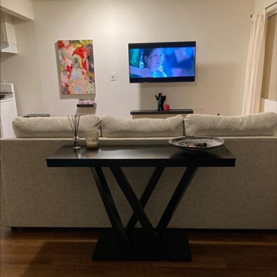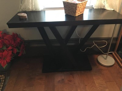 Give your home an element of unmatched polish: the Everdon Designer Console Table is packed with contemporary style. The stately Everdon Sofa Table is crafted in Malaysia with a sturdy engineered wood frame. To clean, wipe the wooden surfaces with a dry cloth. The Everdon Collection also includes a matching coffee table, end table, pub stool, and pub table set (each sold separately). 47.25"W x 15.75"D x 30"H , base : 29.5"W x 10.8"D x 1.375"H, table top thickness: 2.75" 47.25"W x 15.75"D x 30"H , base : 29.5"W x 10.8"D x 1.375"H, table top thickness: 2.75"