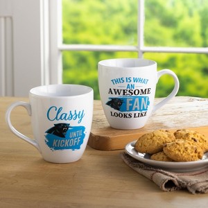 Measures approximately 5.87 x 4.75 inches. This Ceramic Cup O'Java is microwave and top rack dishwasher safe. Comes with a matching gift box. Enjoy a hot coffee or refreshing beverage with these mugs that holds up to 17 oz. Its circular-shaped handle helps you enjoy your morning coffee or hot tea comfortably while supporting your favorite NFL team. Features the official Carolina Panthers logo and colors. These mugs have a sleek design and also include playful text to get you ready for gameday. Reads: "This is what an Awesome Fan Looks Like" and "Classy until Kickoff." Perfect gift for a friend or family member who is a fan of the Carolina Panthers. Evergreen Sports offers nothing but officially licensed college and professional sports league products. We pride ourselves on unique and eye catching designs for every item. Our products make the perfect gift for any occasion for family and friends or yourself! Evergreen Sports features NFL, NHL, MLB & NCAA licensed products. We carry items for every fan shop with