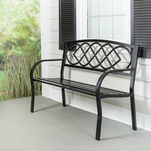 This all-weather steel-frame garden bench features a cast-iron back design with Celtic Knot pattern. The classic black finish with brushed highlights lends a timeless look to any setting. Slatted seat, curved arms and an arched back. 400 lbs limit.