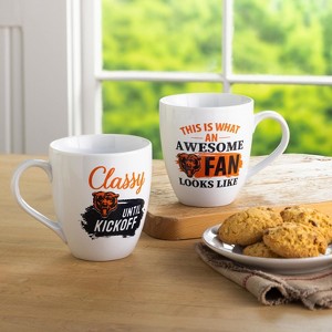 Measures approximately 5.87 x 4.75 inches. This Ceramic Cup O'Java is microwave and top rack dishwasher safe. Comes with a matching gift box. Enjoy a hot coffee or refreshing beverage with these mugs that holds up to 17 oz. Its circular-shaped handle helps you enjoy your morning coffee or hot tea comfortably while supporting your favorite NFL team. Features the official Chicago Bears logo and colors. These mugs have a sleek design and also include playful text to get you ready for gameday. Reads: "This is what an Awesome Fan Looks Like" and "Classy until Kickoff." Perfect gift for a friend or family member who is a fan of the Chicago Bears. Evergreen Sports offers nothing but officially licensed college and professional sports league products. We pride ourselves on unique and eye catching designs for every item. Our products make the perfect gift for any occasion for family and friends or yourself! Evergreen Sports features NFL, NHL, MLB & NCAA licensed products. We carry items for every fan shop with tons of