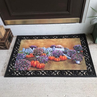 This black rubber floor mat base tray holds a 28"W x 16"L traditional coir mat. The rubber center has holes to allow water to drain and a cut-out scroll border to enhance the look of any design.