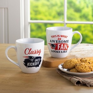 Measures approximately 5.87 x 4.75 inches. This Ceramic Cup O'Java is microwave and top rack dishwasher safe. Comes with a matching gift box. Enjoy a hot coffee or refreshing beverage with these mugs that holds up to 17 oz. Its circular-shaped handle helps you enjoy your morning coffee or hot tea comfortably while supporting your favorite NFL team. Features the official New England Patriots logo and colors. These mugs have a sleek design and also include playful text to get you ready for gameday. Reads: "This is what an Awesome Fan Looks Like" and "Classy until Kickoff." Perfect gift for a friend or family member who is a fan of the New England Patriots. Evergreen Sports offers nothing but officially licensed college and professional sports league products. We pride ourselves on unique and eye catching designs for every item. Our products make the perfect gift for any occasion for family and friends or yourself! Evergreen Sports features NFL, NHL, MLB & NCAA licensed products. We carry items for every fan sho